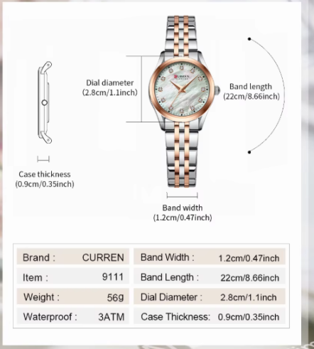 CURREN 9111 Women’s Quartz Watch — Luminous Hands, 30 m Water Resistant